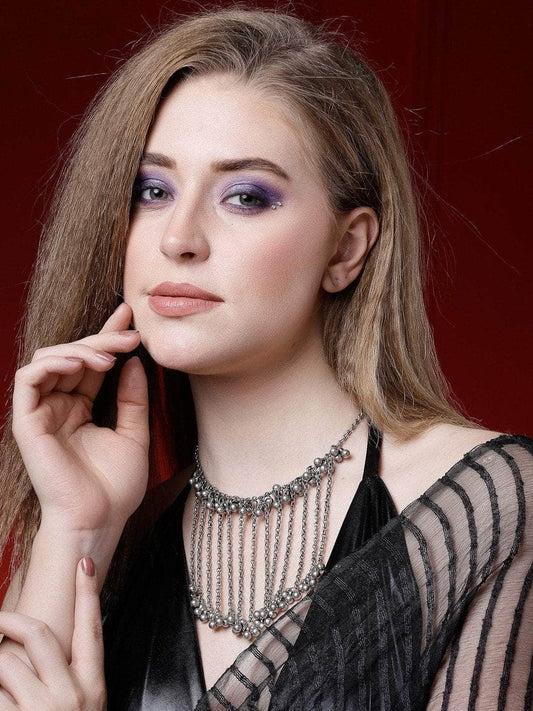 Ghungroo Studded Antique Filigree Design Oxidised Silver Plated Tasselled Choker Necklace