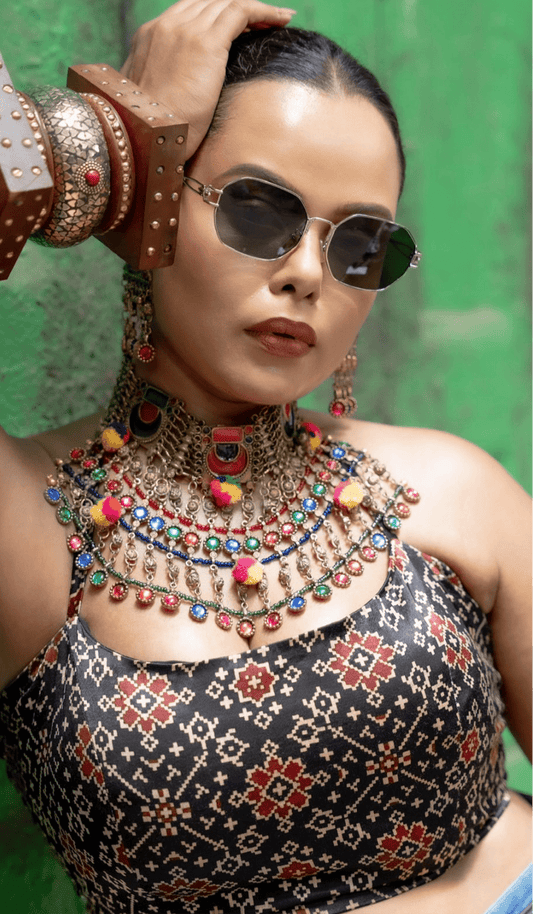 Heer Meenakari Work Afghan Tribal Design Oxidised Golden Plated Handcrafted POM POM Jewellery Set