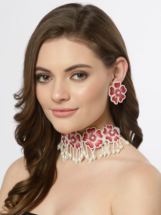 This elegant Silver-Plated Pink & Off White Pearls-Studded Floral Jewellery Set is crafted with sophistication...