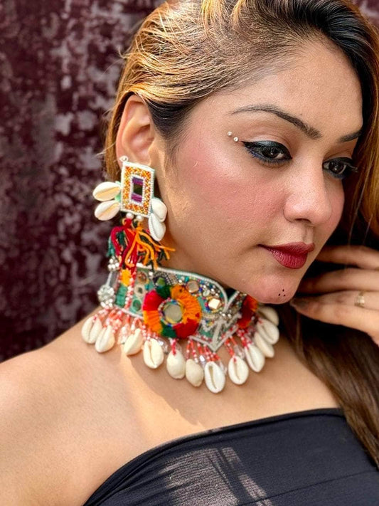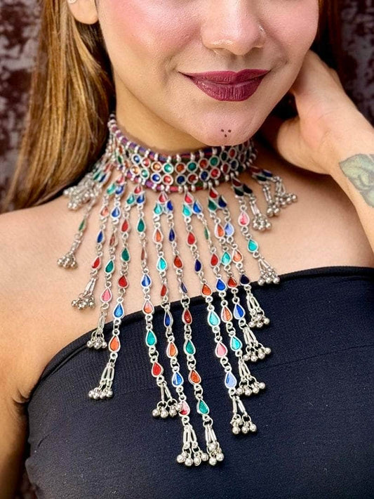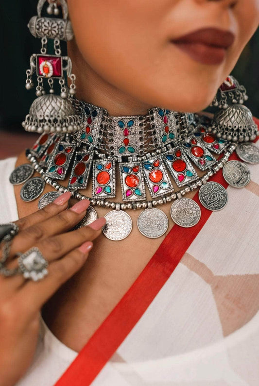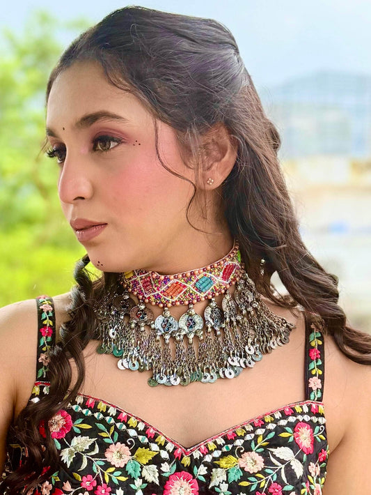 Navratri Special Multi Colored Handcrafted Meenakari Oxidised Coin Choker With Jhumki Jewellery Set