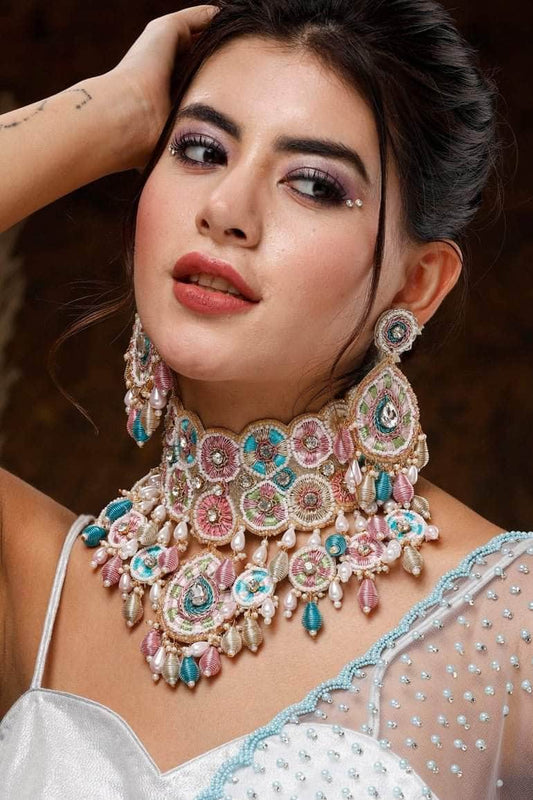 Elevate your traditional look with this stunning handcrafted jewellery set, featuring a statement necklace, matching...