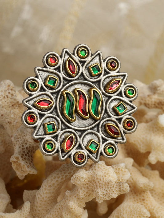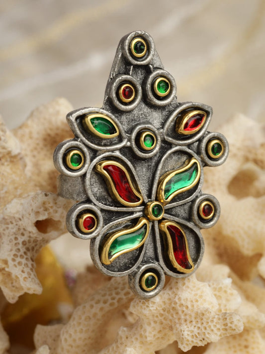 Silver-plated adjustable finger ring, has red and green crystal-studded and slip-on closure Size...