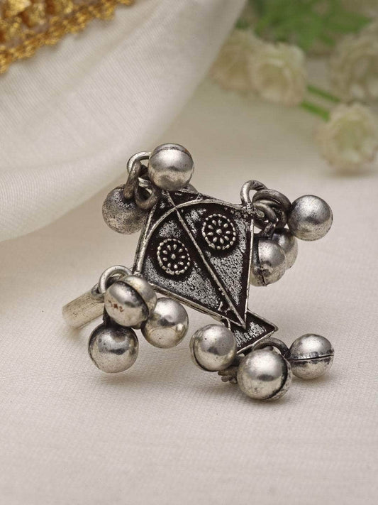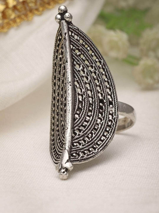 Silver-plated adjustable finger ring, has handwoven oxidised with beads and slip-on closure Size &...
