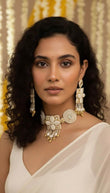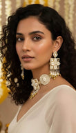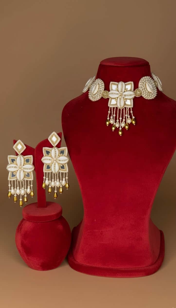 Embrace regal grace with Aabroo, a handcrafted choker set adorned with off-white and golden pearls, delicate mirror accents, and intricate cowrie work. The floral design radiates timeless charm, while the cascading pearl drops add a hint of royal allure. Paired with statement earrings, this set is perfect for festive celebrations, weddings, and elegant soirées.