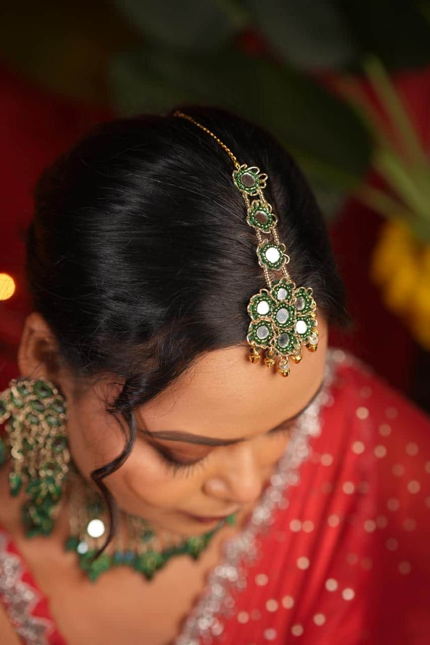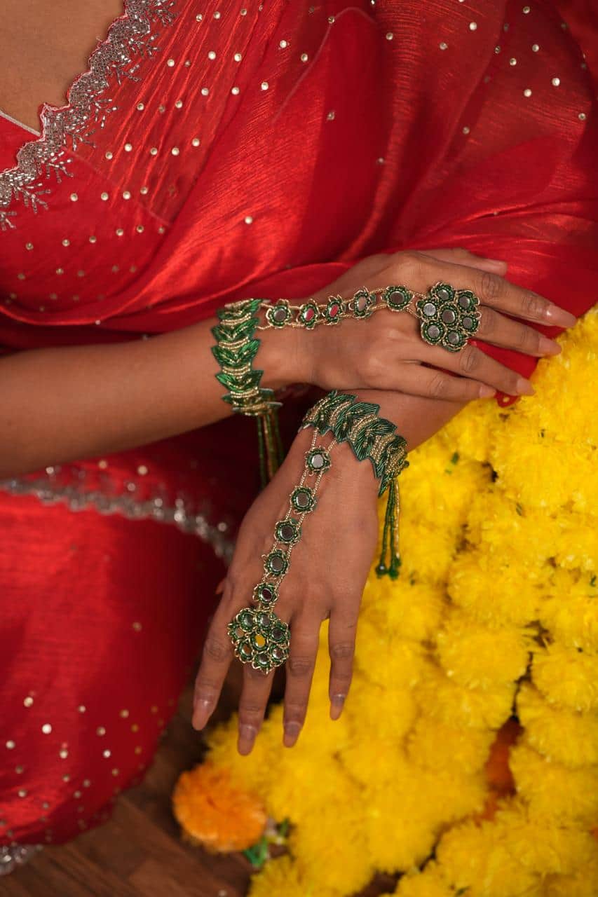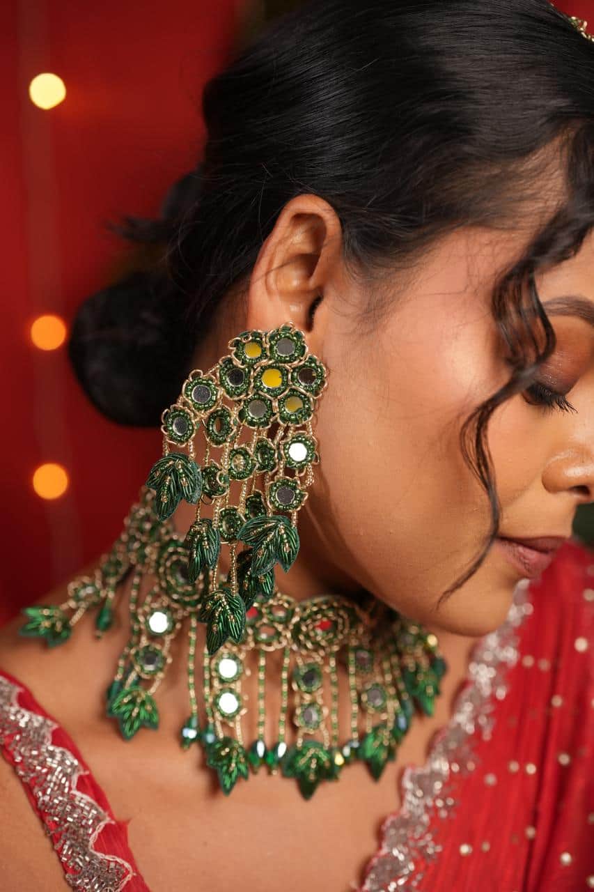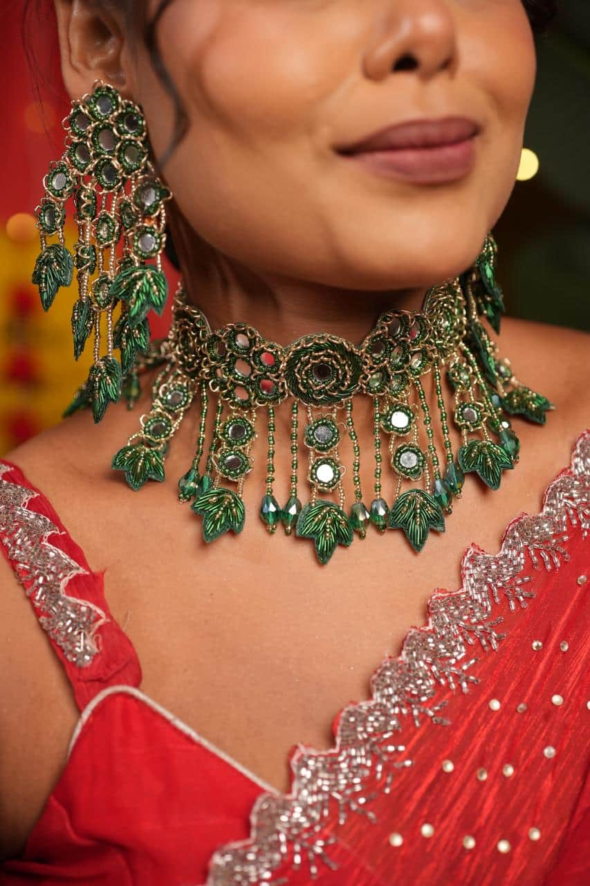 Shine with effortless grace in our Aarzoo Green bridal jewellery set, a stunning fusion of mirror work, zardosi and resham embroidery, premium beads, and sparkling zircons. Every detail reflects delicate craftsmanship and modern bridal elegance.