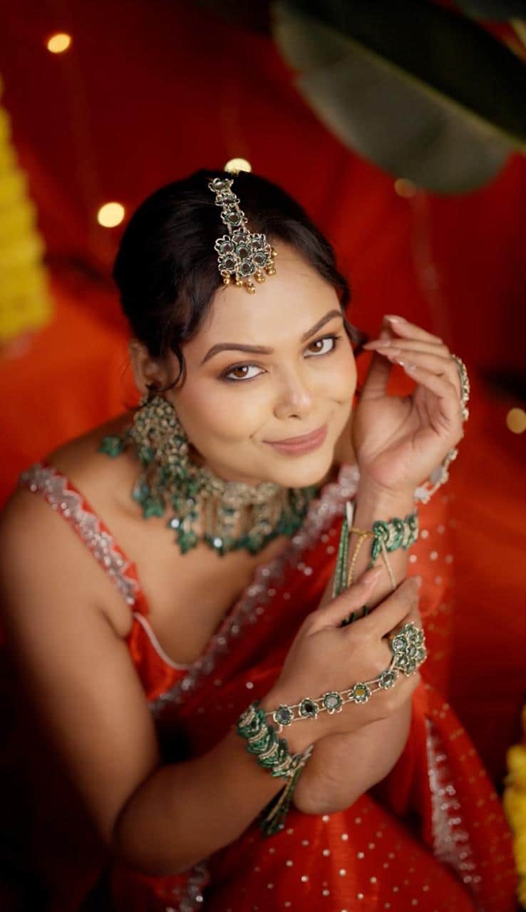 Lightweight yet luxurious, this set lets you enjoy every moment — from haldi laughter to wedding vows — without the weight of heavy jewellery. Each piece is intricately handcrafted to radiate warmth, beauty, and confidence — because your special day deserves both comfort and sparkle.