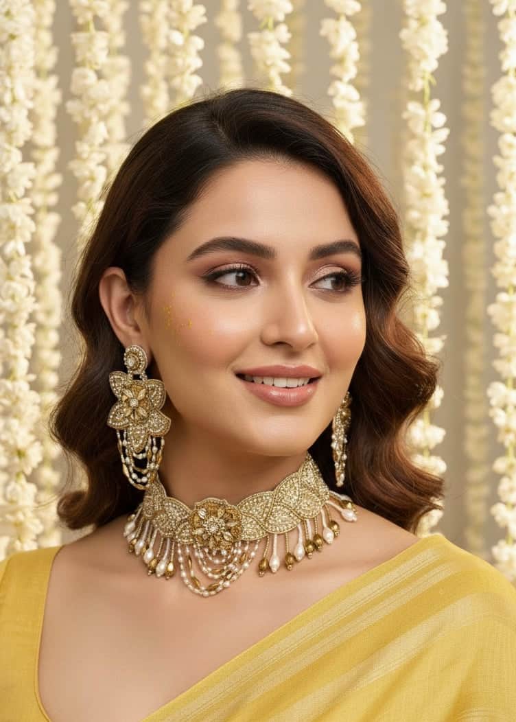 Handcrafted to perfection, this exquisite floral design choker set blends gold and off-white hues in timeless elegance. Adorned with intricate AD work, delicate bead detailing, and cascading pearl strings, it radiates a royal charm. The bold floral motifs add a touch of grandeur, making it an ideal pick for your haldi, mehndi, or any special celebration. Pair it with traditional or fusion attire and let your inner queen bloom.