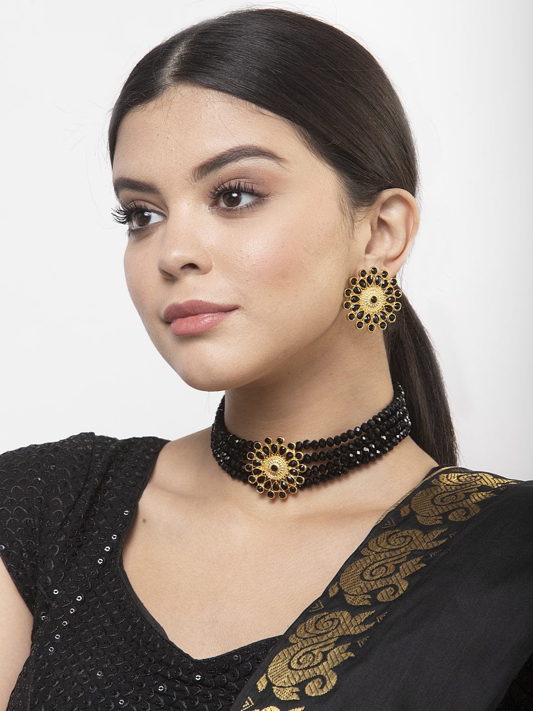Black Stones and Beads Studded cGold Plated Handcrafted Jewelry Set