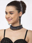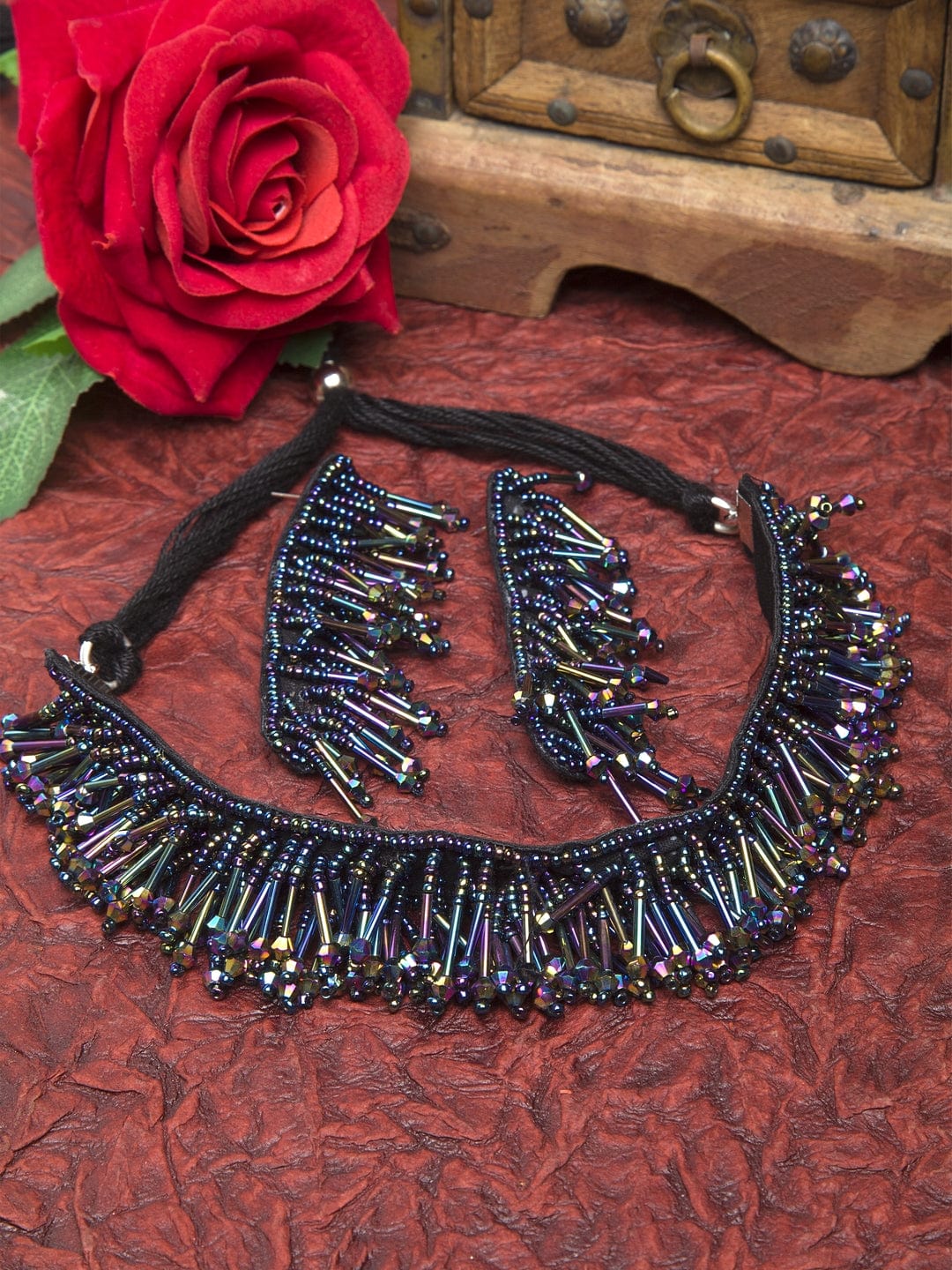 Blue Beads and Stones Studded Tasselled Afghan Design Handcrafted Choker Necklace and Drop Earrings
