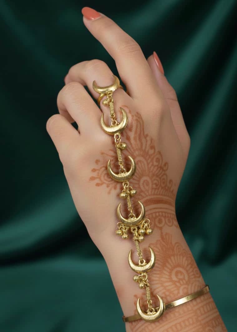 Elevate your festive and bridal look with these stunning Brass Ghungroo Chand Hathphool, designed to drape your hands in rhythmic elegance. Crafted with crescent-shaped chand motifs and delicate chains adorned with tinkling ghungroos, this piece blends tradition with a bold, modern charm.