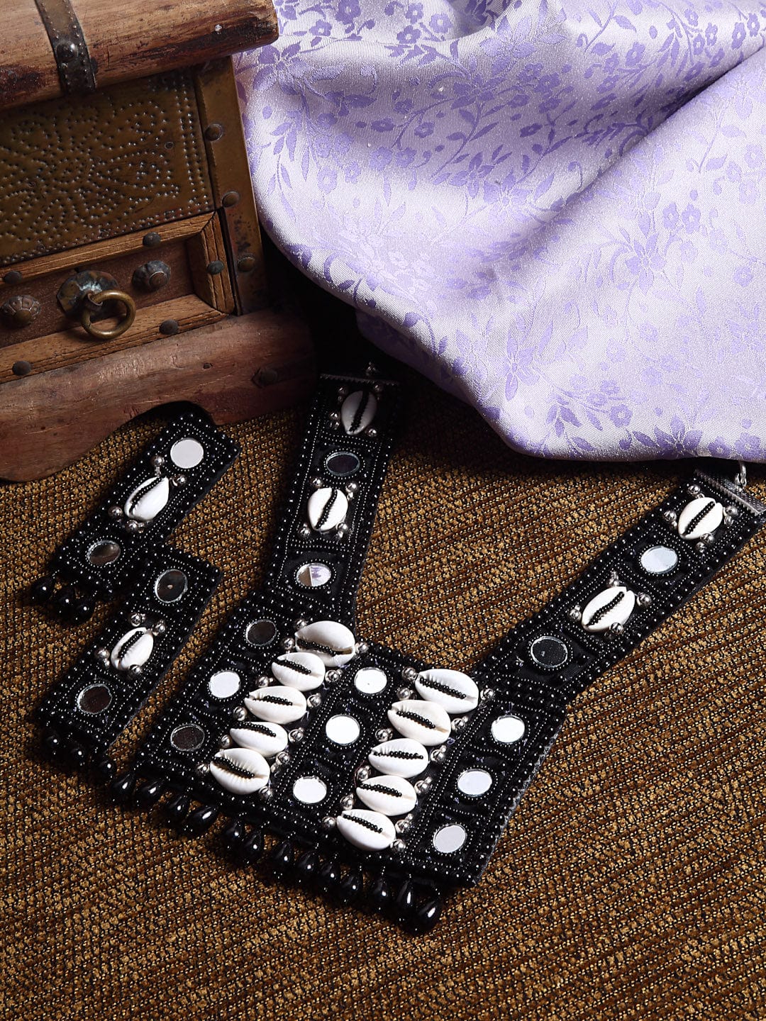 Silver-plated handcrafted necklace has black and white beaded and Pearls, Cowri , Mirrors embroidered design