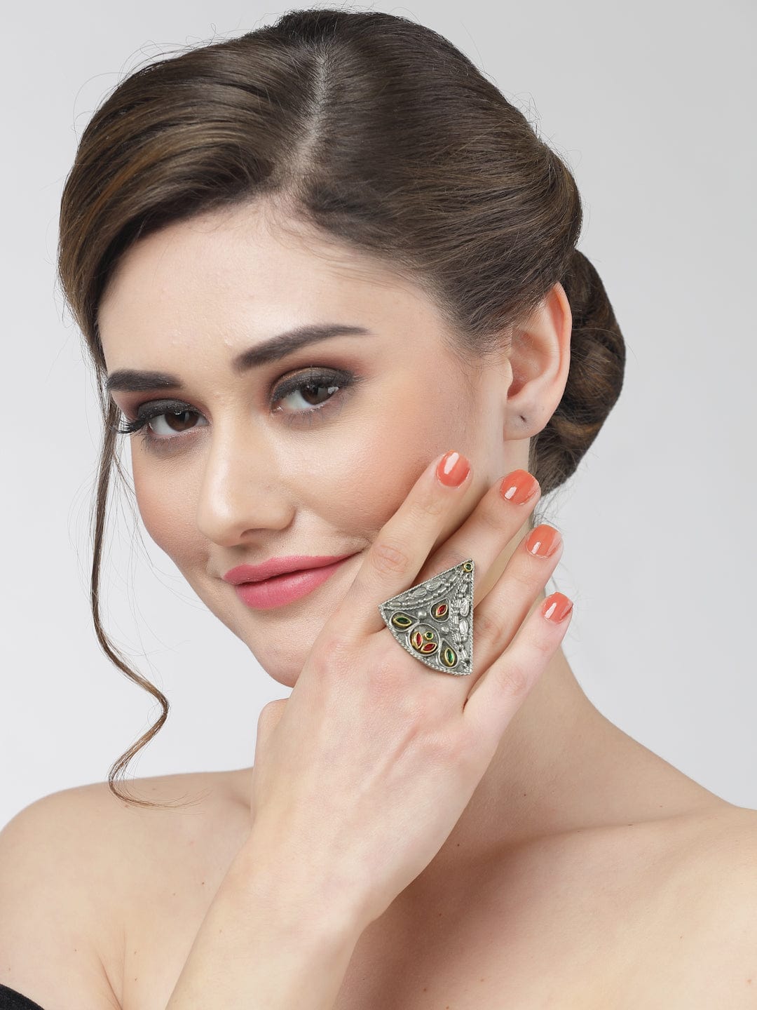 Crystal-Studded Antique Tribal Design Oxidised Finger Ring