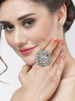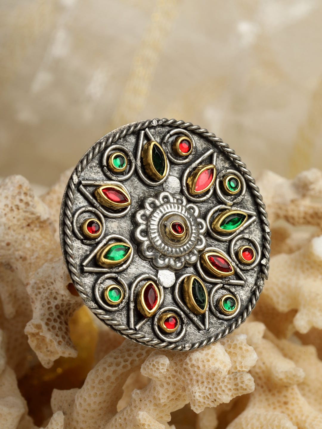 Silver-plated adjustable finger ring, has red and green crystal-studded and slip-on closure