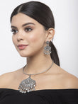 This Oxidised Silver Plated Handcrafted Afghan Design Jewelry Set features attractive Ghungroo Studded accents that will add an elegant touch to any look. Crafted with exquisite detail, this jewelry set is sure to make a statement. Wear it to the party or the wedding for a timelessly beautiful look.