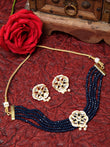 Gold-plated Blue and white kundan and onyx stone-studded multi-stranded choker necklace, has pearl beaded flower-shaped centrepiece