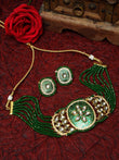 Gold-Plated Green & White Kundan & Onyx Stone-Studded & Pearl Beaded Meenakari Jewellery Set