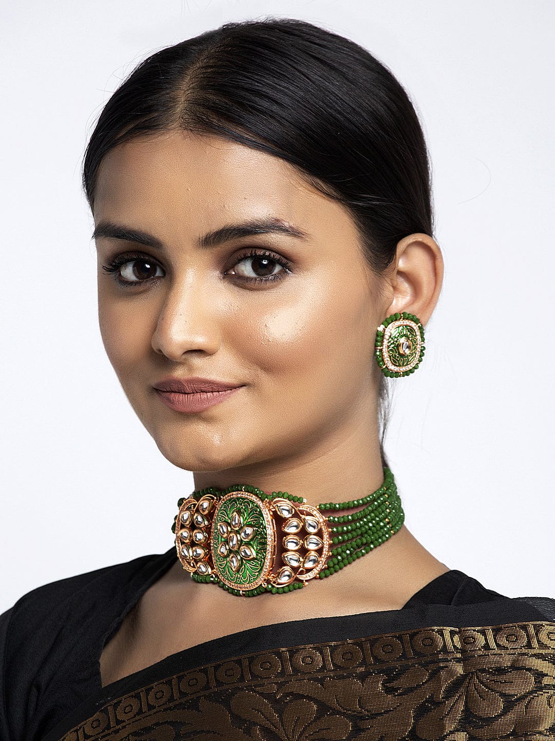 This exquisite gold-plated jewellery set features green and white kundan, onyx stones, and pearl beads, intricately meenakari-crafted for an elegant finishing touch. The perfect accessory to take you from day-to-night in style.
