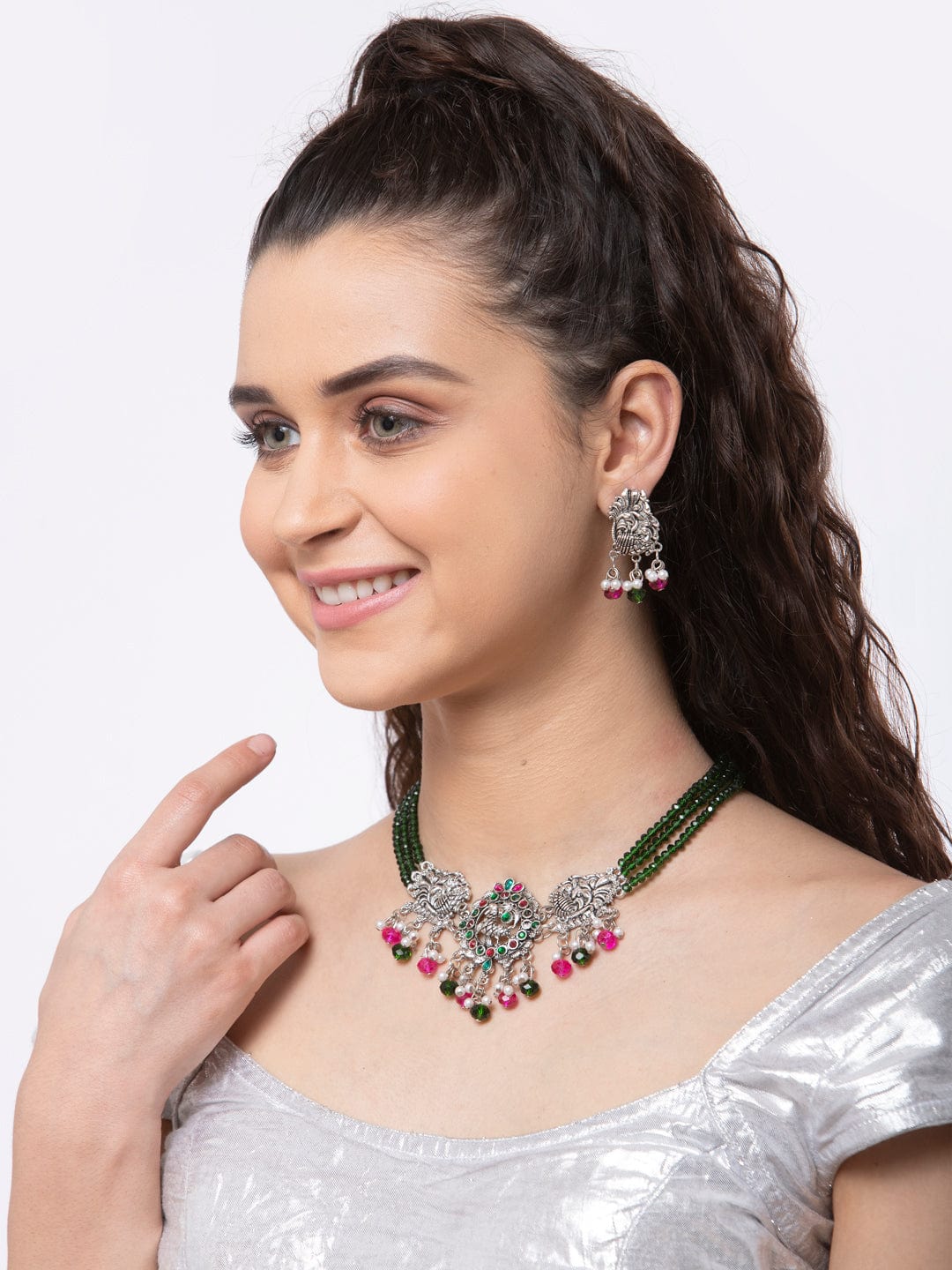 Green & Pink Temple Design Silver-Plated Crystal Oxidized Choker Jewellery Set