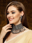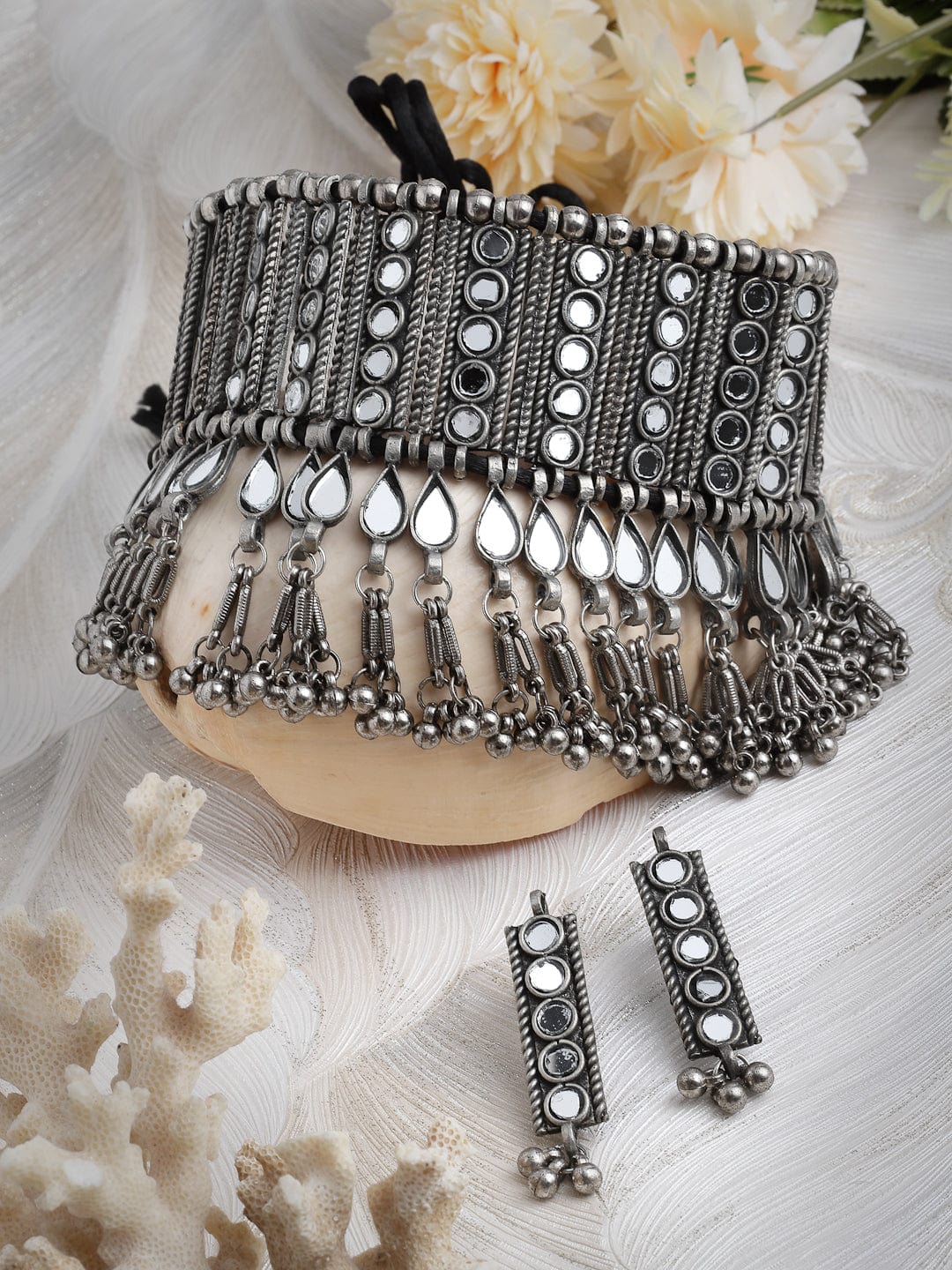 Gunmetal Mirror Studded Tesseled Chokar Jewellery Set