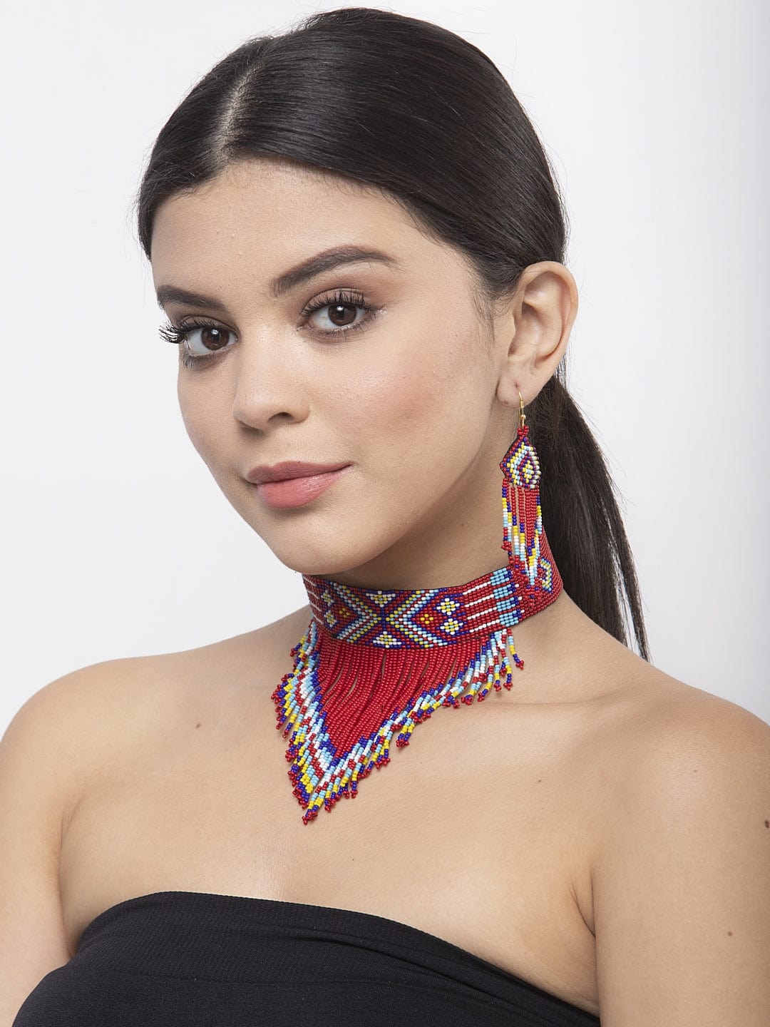 Silver-plated hand woven red beaded fringe handcrafted afghan choker necklace