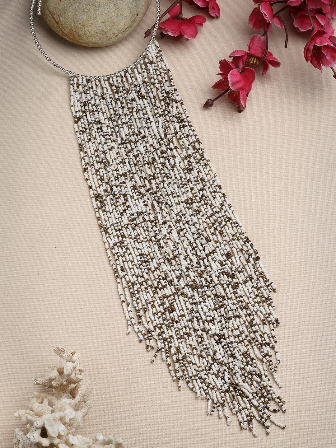 Handcrafted Beads Studded Layered Tasselled Design Oxidised Silver Plated Choker
