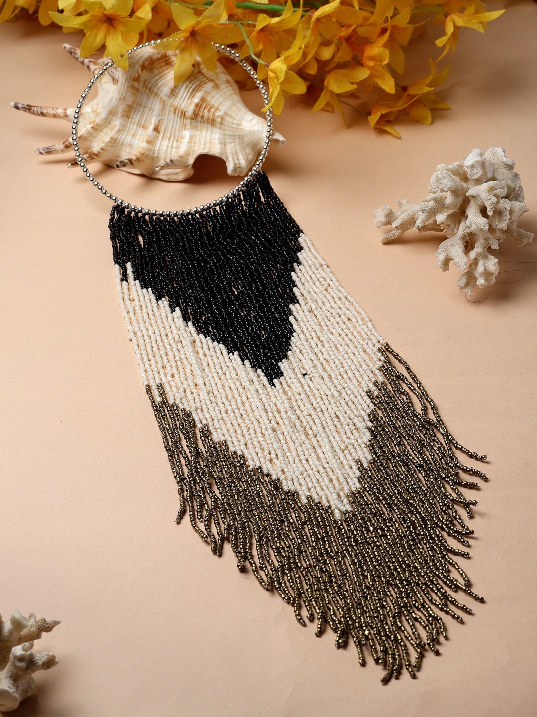 Handcrafted Beads Studded Layered Tasselled Design Oxidised Silver Plated Choker