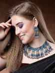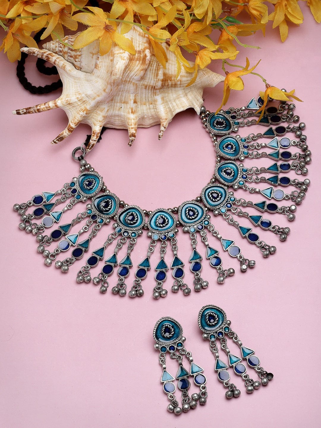 Handcrafted Blue Meenakari Work Tasselled Design Silver Plated Antique Tribal Jewellery Set