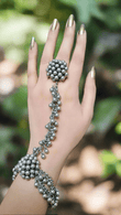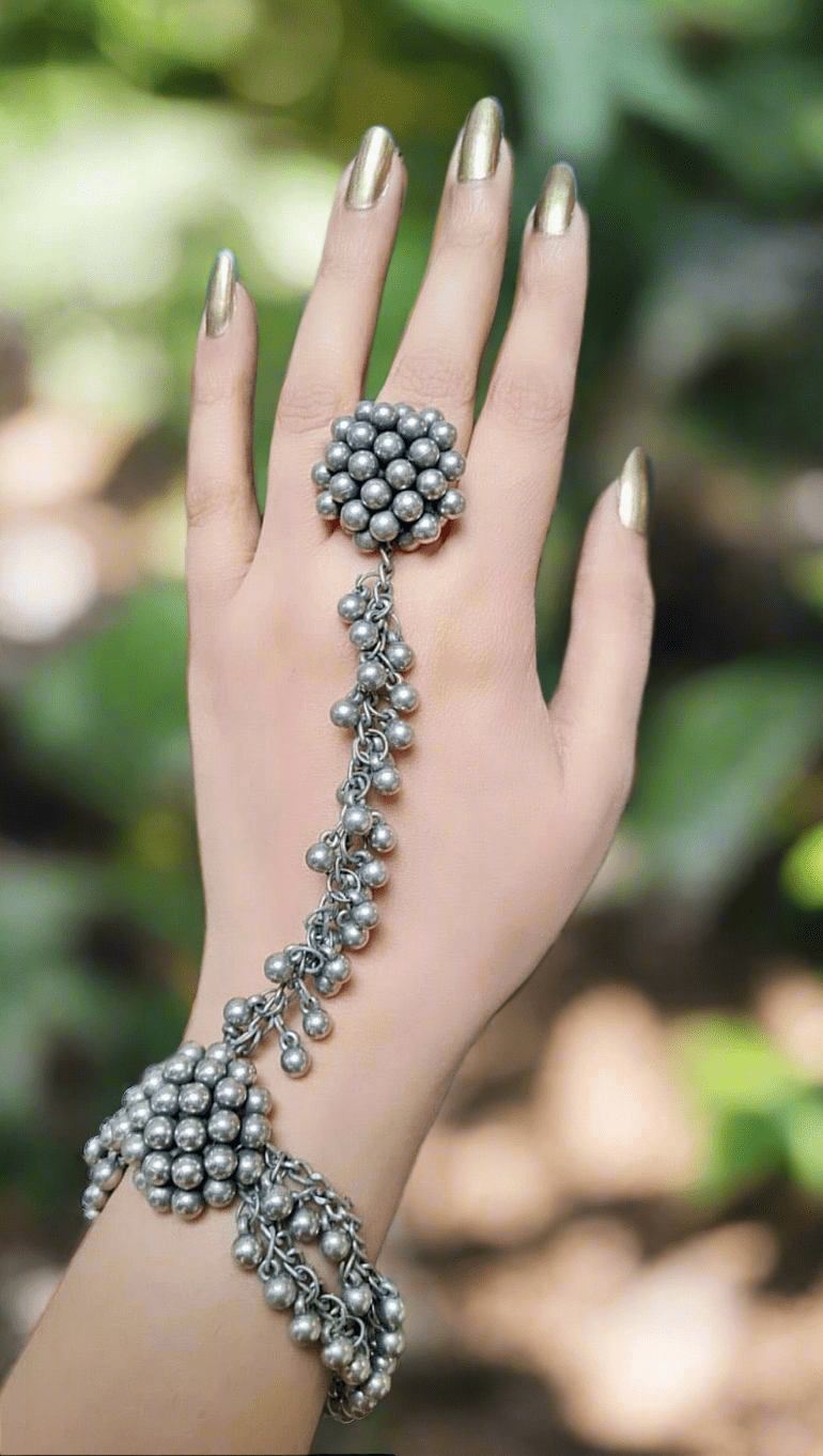 Handcrafted Ghungroo Studded Tribal Design Oxidised Silver Plated Bracelet