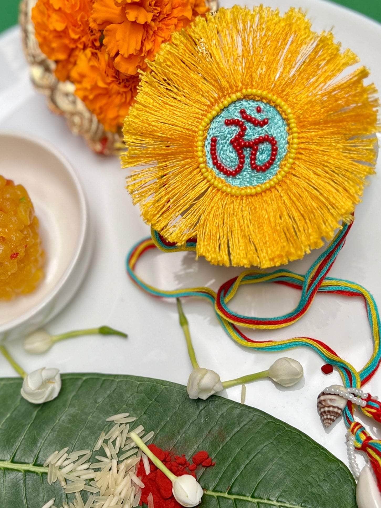 Handcrafted OM Silk Threaded Multi Strand Rakhi with Roli-Chawal