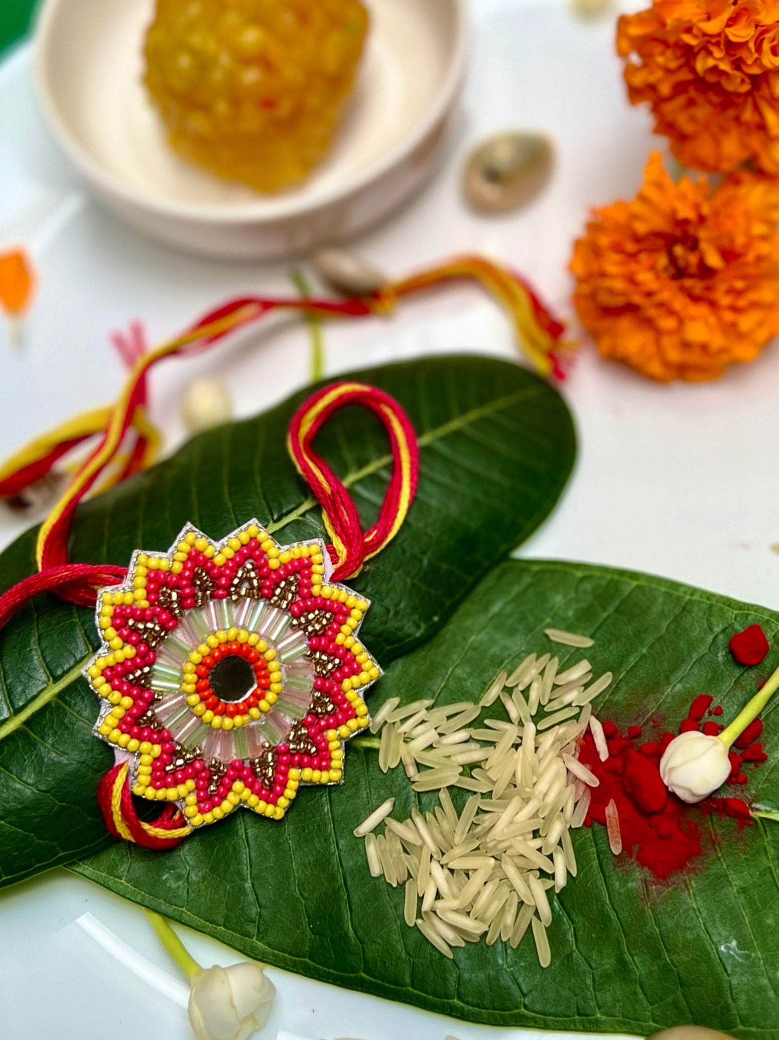 Handcrafted Mirror Studded Traditional Rakhi with Roli-Chawal
