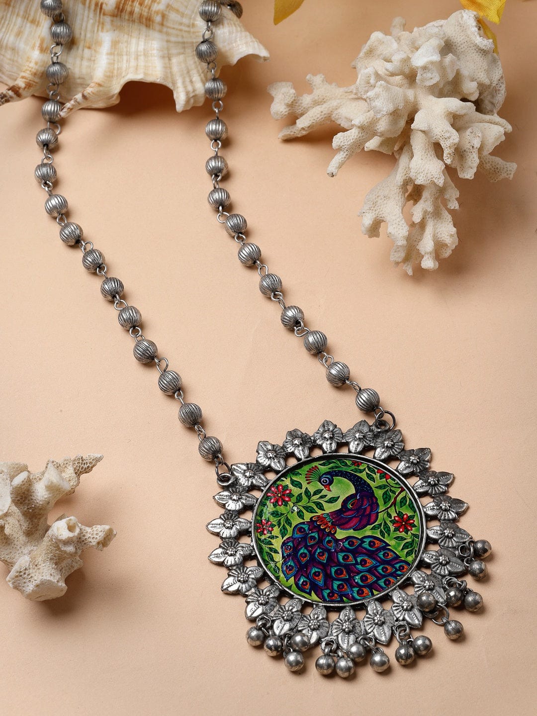 Handpainted Meenakari Work Tasselled Design Oxidised Silver Plated Pendant Necklace
