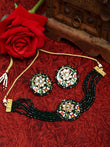 Gold-plated green onyx bead multi-stranded handcrafted choker necklace, has white Kundan-studded centrepiece with meenakari detailing