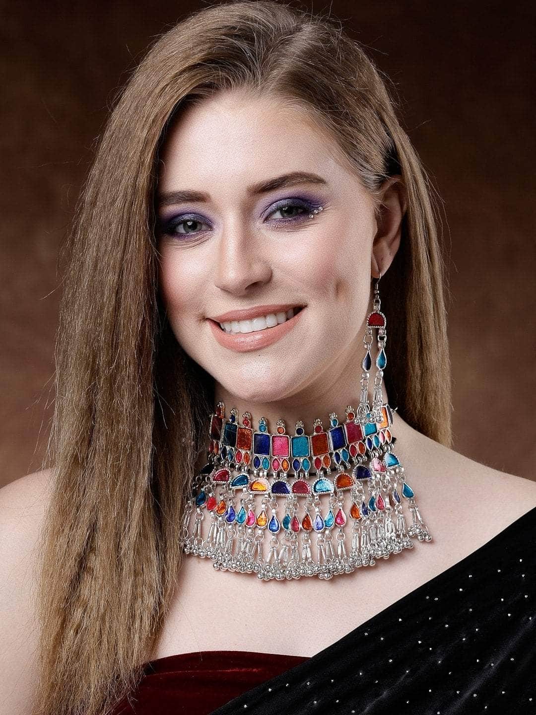Meenakari Work Afghan Design Oxidised Silver Plated Handcrafted Tasselled Jewellery Set