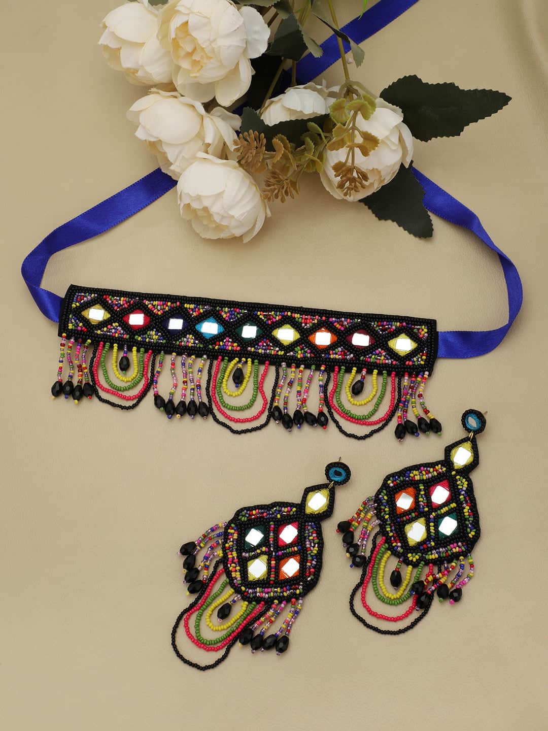 Add a burst of vibrant charm to your ethnic look with this handcrafted beaded mirror necklace set. Meticulously designed by skilled artisans, the necklace features colorful glass mirror work bordered with fine black bead detailing, creating a striking contrast. Multicolour seed beads cascade gracefully, finished with glossy black bead drops that add movement and drama.
