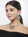 Oxidized silver-plated and crystal-studded handcrafted hasli choker necklace, has mirror and ghungroo detailing