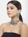Oxidised silver-plated handcrafted afghan design choker necklace, has mirror work and ghungroo beads