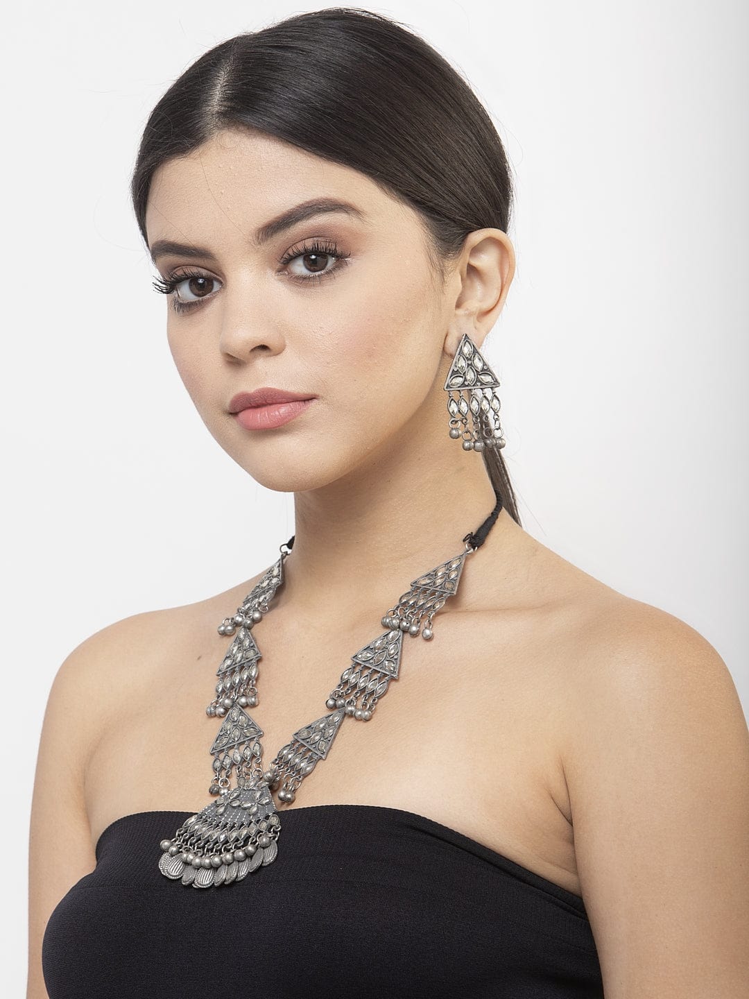 Oxidised silver-plated white stone-studded necklace, secured with a tie-up closure