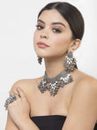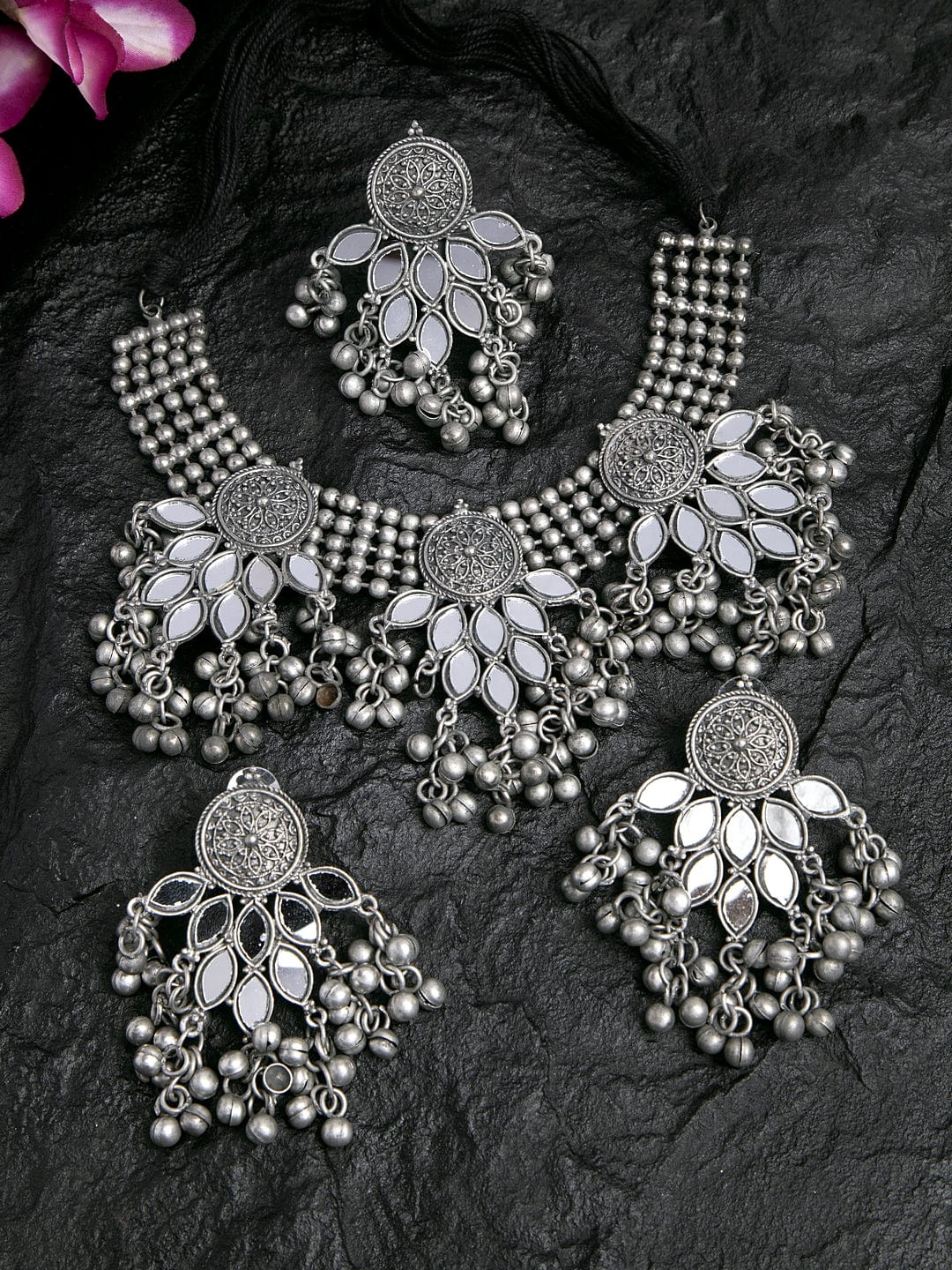 Mirrors & Ghungroo Studded Oxidised Silver Plated Handcrafted Jewelry Set with Ring