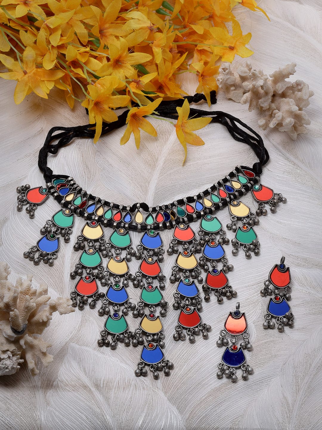 Multi Color Mirror Studded Layered Chokar Necklace Set