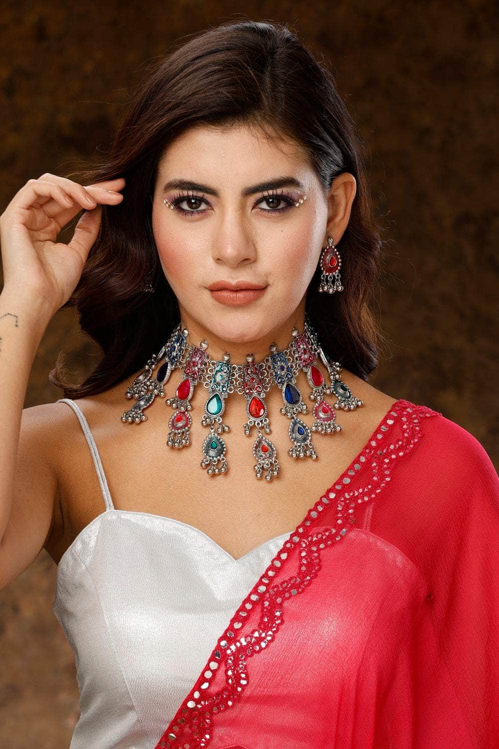 Multi Colored Handcrafted Meenakari Work Afghan Tasselled Design Oxidised Choker Jewellery Set