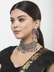 This unique jewelry set features a combination of multi-stone studded silver plating and a handcrafted tassel design. The oxidized finish is sure to catch the eye and make a statement. Perfect for any occasion, this multifaceted set is sure to become an eye-catching staple in your jewelry collection.