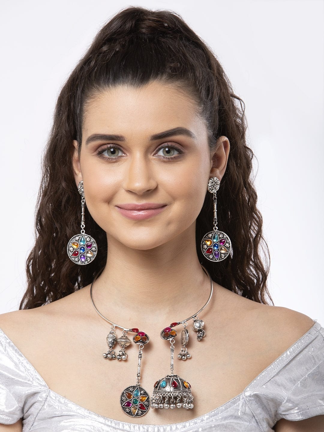 Multicoloured Silver-PlatedHandcrafted Tasseled Oxidised Jewellery Set