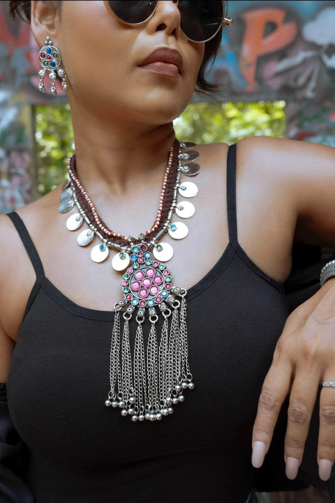 Navratri Special Antique Oxidised Silver Plated Stone Studded Handcrafted Coin Jewellery Set