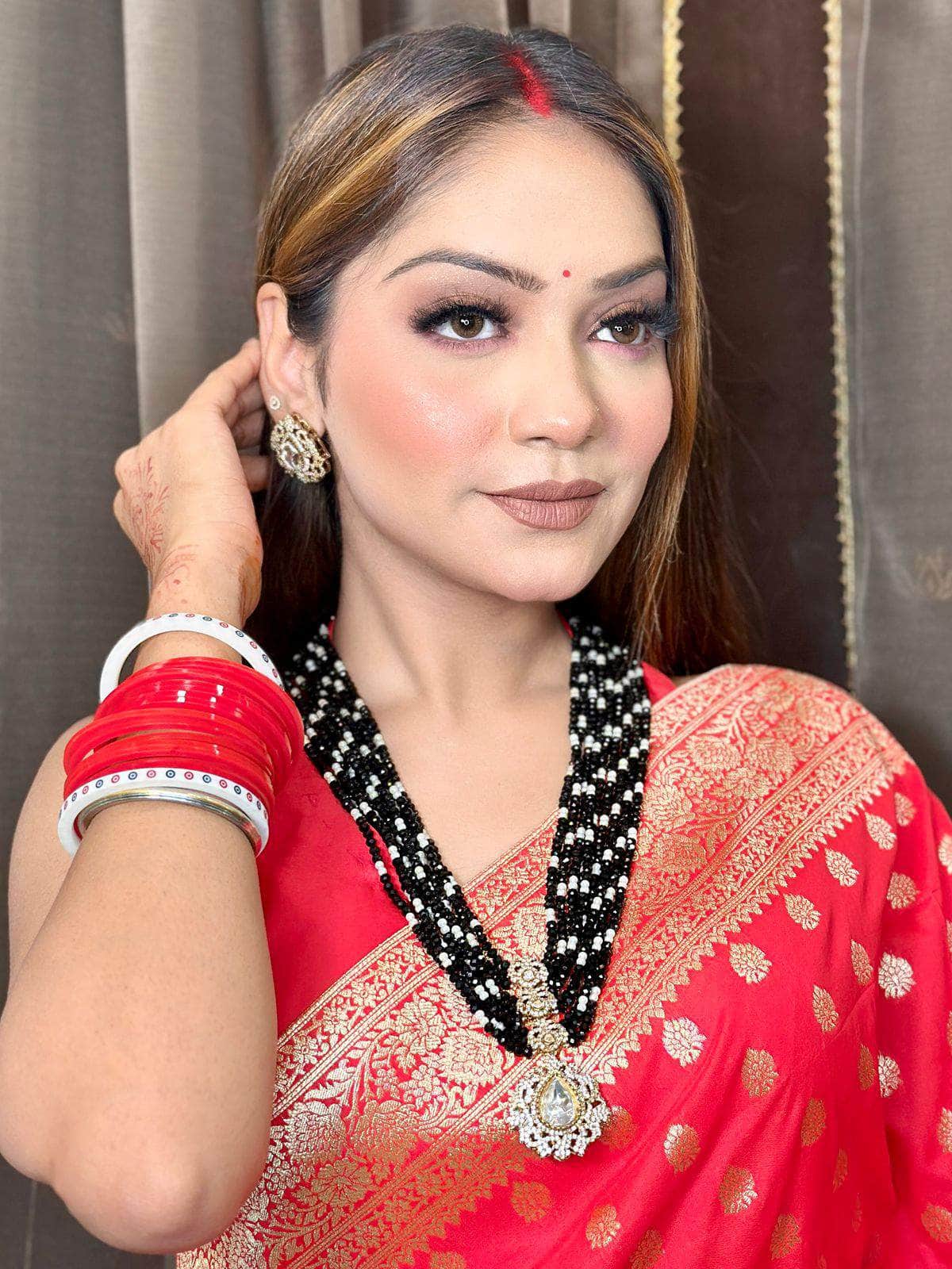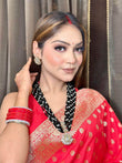 Add a touch of elegance to your look with this stunning handcrafted jewellery set. This set is perfect for any special occasion. The intricate detailing and timeless design make this a must-have accessory for your wardrobe.