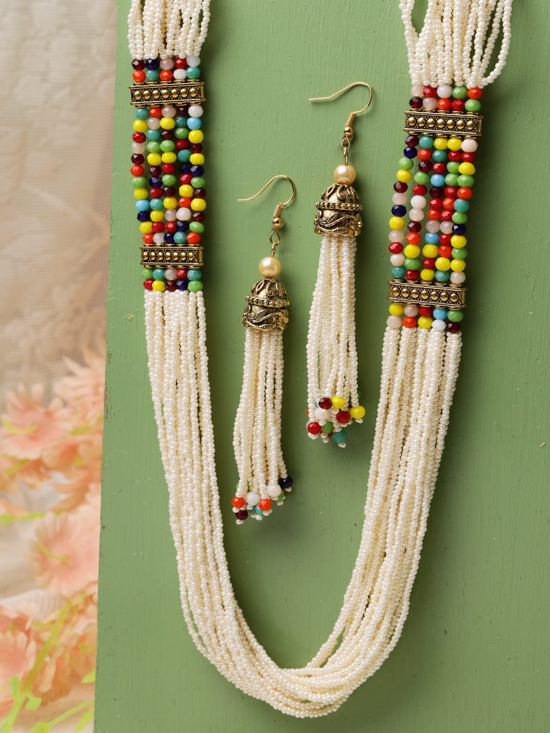 Off White Beads studded Tasseled design necklace with matching eardrop