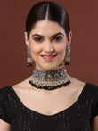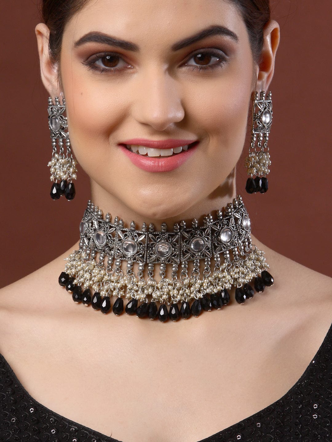 Oxidised Silver-Plated Black & White Stone-Studded Jewellery Set