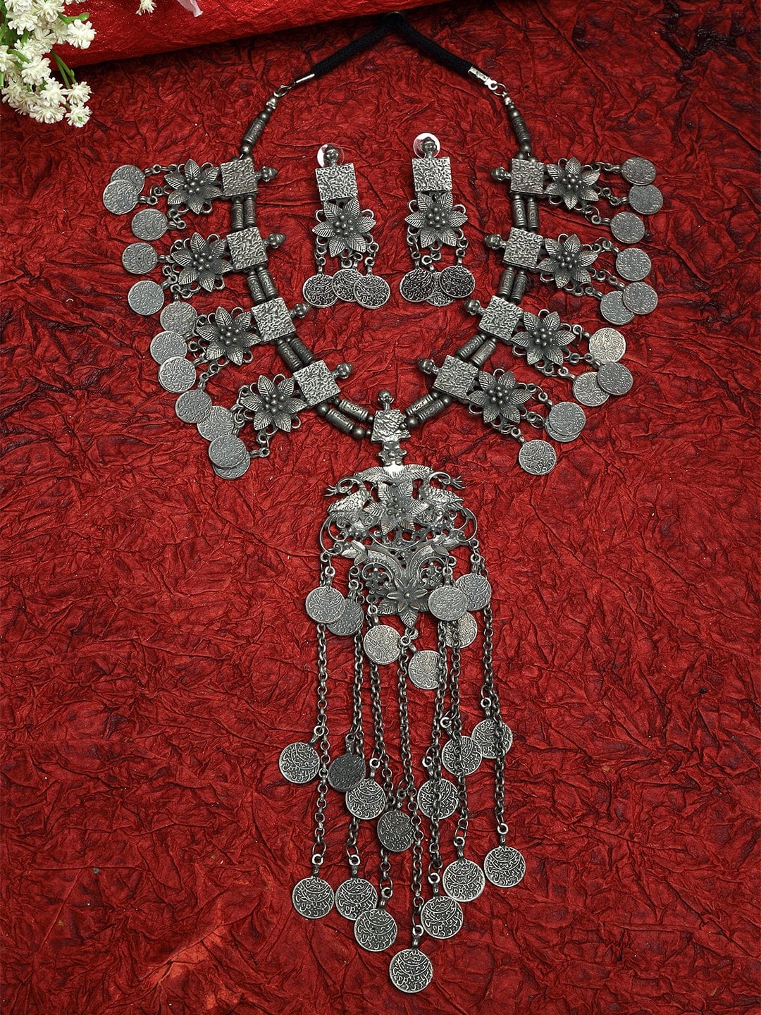 Oxidised Silver-Plated Handcrafted Tribal Tasselled Floral Jewellery Set
