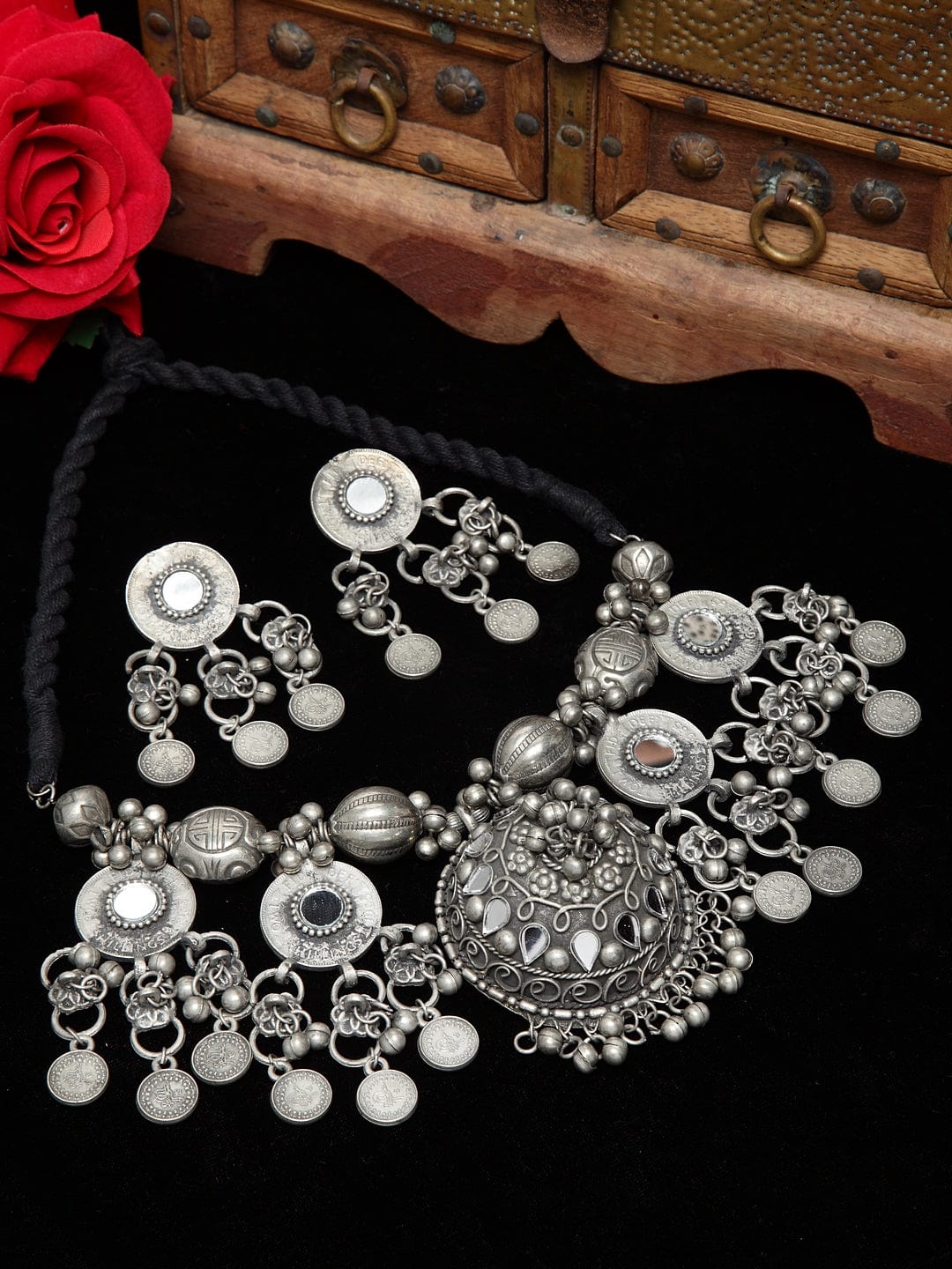 Oxidised silver-plated metallic-toned tribal design handcrafted Afghan necklace has mirror-studded details