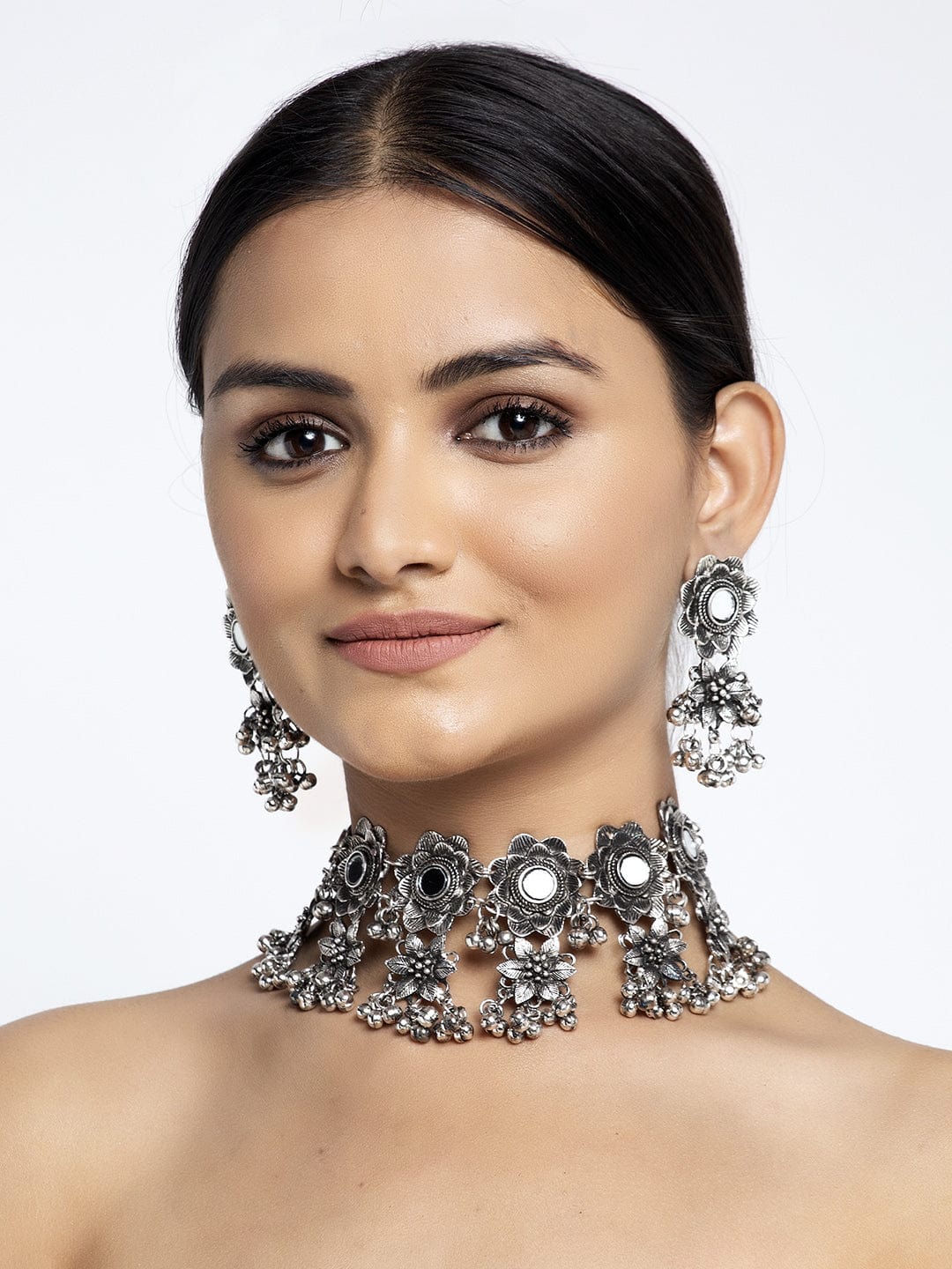 Oxidised silver-plated handcrafted tasselled choker necklace, has a mirror-studded detailing