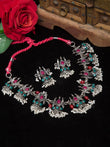 Adorn yourself with the sophistication of this unique temple jewellery set. Crafted with love, it's plated in oxidised silver and encrusted with green and pink stones. Experience the handcrafted beauty for yourself.